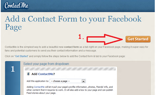 1. Esteja conectado em sua conta do Facebook e acesse: ContactME Facbook App. Então, na janela do aplicativo, clique no botão “Get started”.