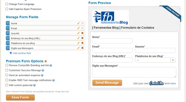 6. Clicando no botão azul da aba “Customize My Form” você será levado à página do ContactME para modificar e melhorar seu formulário padrão. Tudo o que você fizer aí será aplicado automaticamente na página do Facebook.