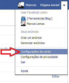 Acesse a sua conta padrão do Facebook, como você faz normalmente. No canto superior direito da tela, clique na seta apontando para baixo, que fica ao lado de “Página inicial”. Isso exibirá o menu: