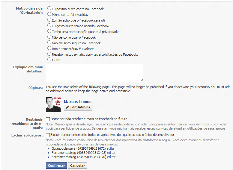 Se tem certeza do que vai fazer, então clique no botão “Confirmar” e pronto! Será solicitada a confirmação de sua senha atual e uma verificação de palavras, então… Adeus rede social.