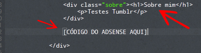 Após localizá-la adicione o código do adsense em algum local de sua preferênciadepois do código descrito acima. Se você não tem familiaridade com a codificação do seu tema, basta procurar uma referência, por exemplo, se quiser adicionar abaixo da barra “Sobre mim”, basta procurar por este nome no código HTML e colar o código logo abaixo.