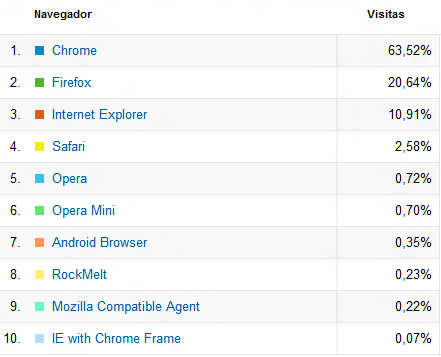 Aqui no [ Ferramentas Blog ], boa parte de nosso público usa o Chrome, seguido por apenas 20% do FireFox e 10% do Internet Explorer.